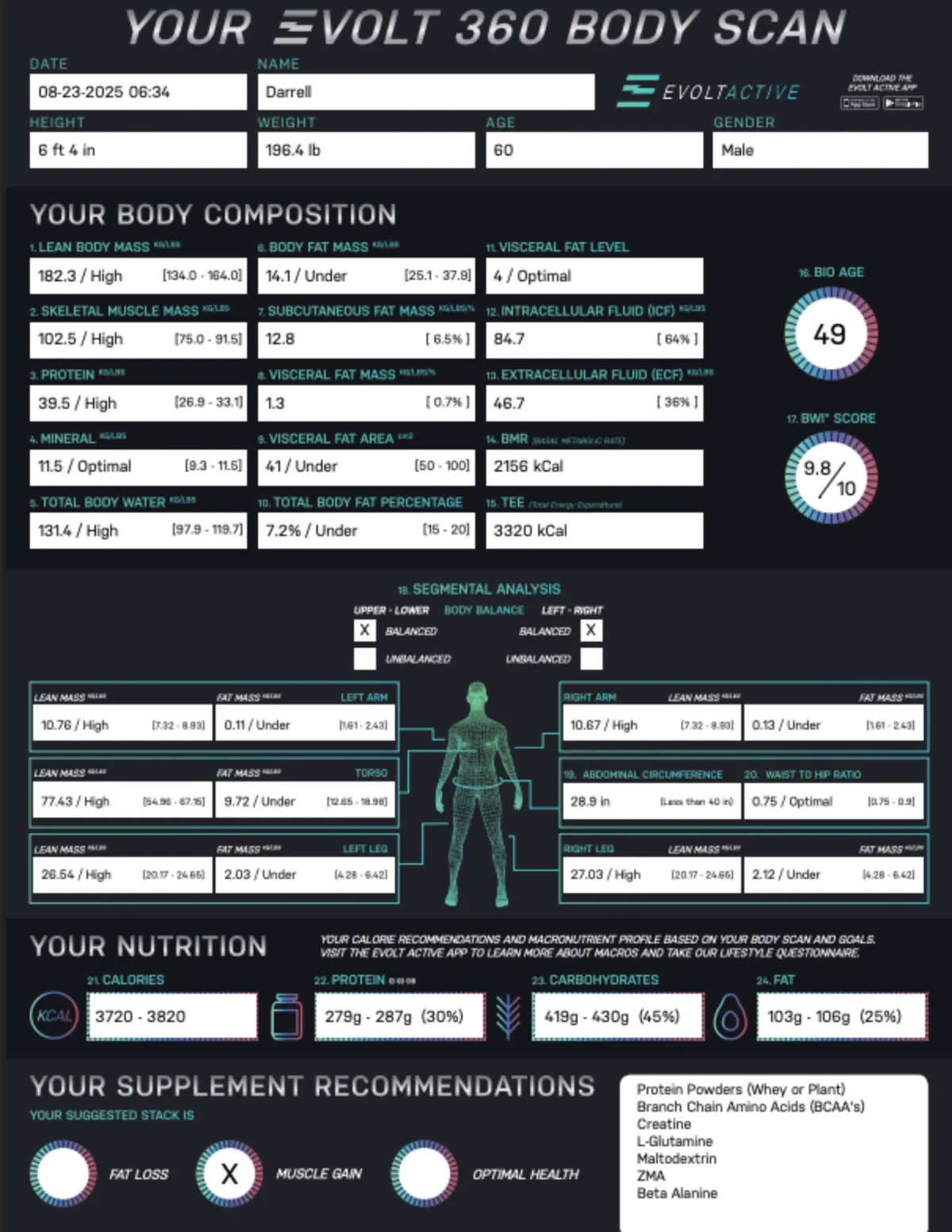 This is one of the scan’s biggest “wake-up call” moments. Your Bio Age reflects your body fat, muscle mass, visceral fat, and metabolic markers. It’s a fast way to see if your body is aging faster or younger than your birth certificate.